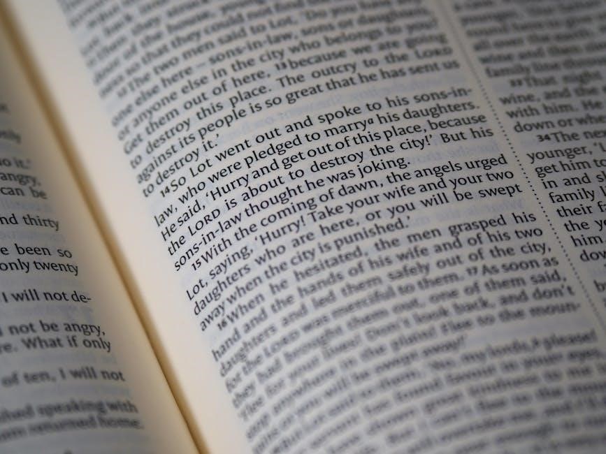 The narrative continues with Isaac and his wife Rebekah‚ followed by the complex story of Jacob and Esau‚ marked by deception and rivalry․ Jacob’s journey to Haran‚ his dream at Bethel reaffirming the covenant‚ and his eventual reconciliation with Esau are key events․